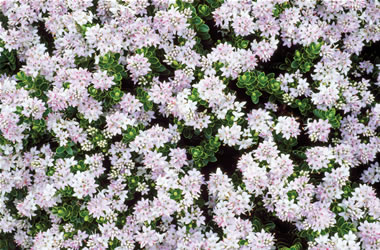 | a neat, rounded, evergreen shrub with oval, mid green leaves and short spikes of soft pink flowers, fading to pale pink |