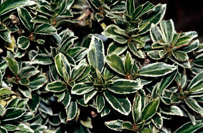 | Japanese spindle. A small evergreen shrub with dark green leaves, each with a narrow white margin. Back-fill with soil mixed with peat substitute and a suitable fertiliser. |