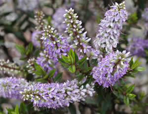 | 'Purple Princess' is an erect evergreen shrub with with spear-shaped green leaves tinged purple on the edges. In summer and autumn it bears purple-blue fading to white flowers in racemes. |